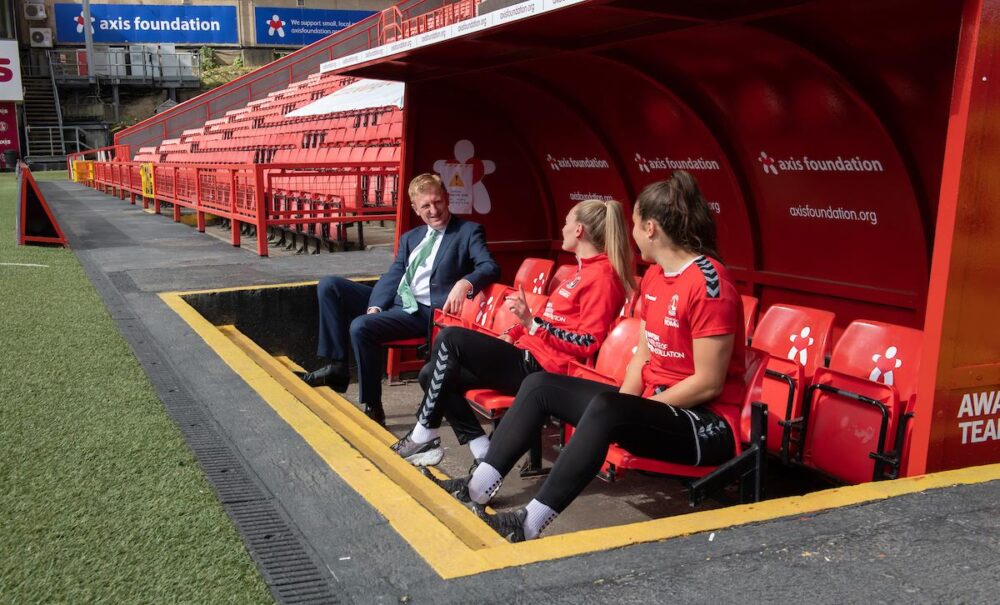 Secretary of State for Digital, Culture, Media and Sport Oliver Dowden MP, Rahael Newborough of Charlton Athletic Women’s Team and Eartha Cumings of Charlton Athletic Women’s Team (right) pictured during a visit to The Valley, home of Charlton Athletic. Picture by Alan Stanford/Stella Pictures Ltd