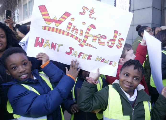 Children from St Winifred’s school hold a banner which reads “St Winifred’s want safer homes” (Picture: Salomé Revault d’Allonnes – Citizens UK)