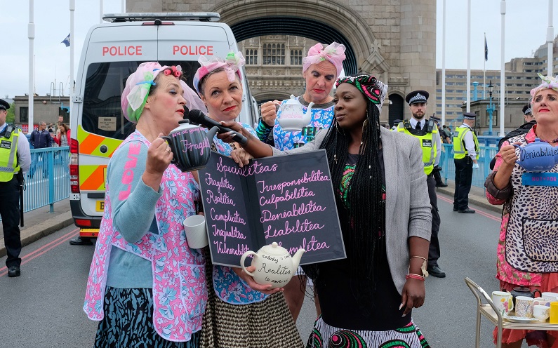Demonstrators wore aprons with “Tell the Truth” and with teapots bearing the word “Deniabilitea”.