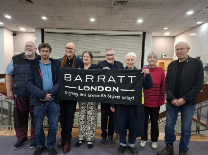 Pictured top: Residents who oppose Barratt London’s plans for the Bell Green gasworks site in Sydenham, South East London at Catford town hall on Tuesday (Picture: LDRS)