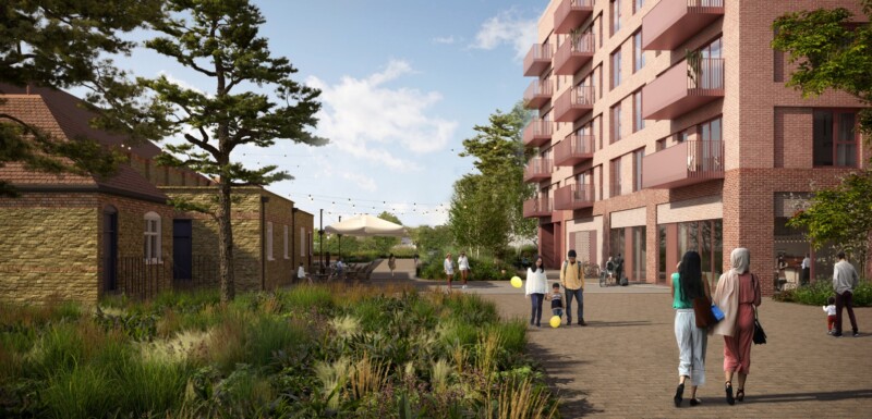 CGI of approved homes on the Bell Green gas works site in Sydenham, South East London. The Livesey Hall can be seen on the left of the image. (Picture: Lewisham council planning documents)