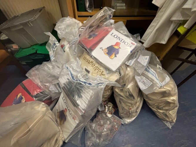 Pictured top: Paddington Bear tote bags were amongst the counterfeit items seized by the council (Picture: Kensington and Chelsea council)