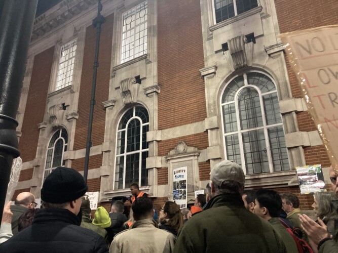About 60 demonstrators gathered outside Lambeth Town Hall in Brixton on Wednesday evening after their application to speak at a council meeting was rejected.