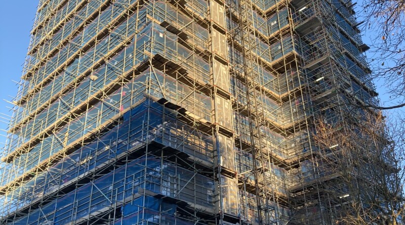 Pictured top: Hazlewood Tower in North Kensington covered in scaffolding in December 2022 (Picture: Adrian Zorzut)