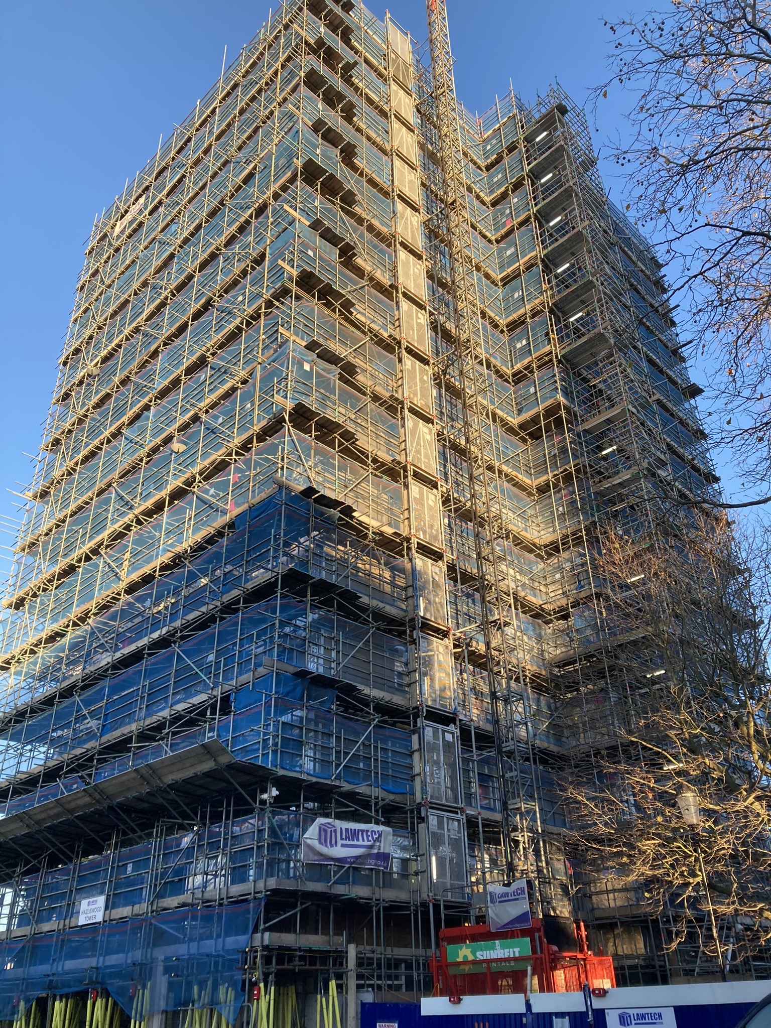 Pictured top: Hazlewood Tower in North Kensington covered in scaffolding in December 2022 (Picture: Adrian Zorzut)