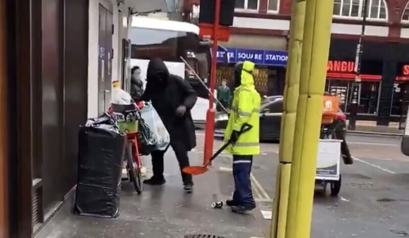 A London road sweeper has been filmed hitting a homeless man over the head with a broom.