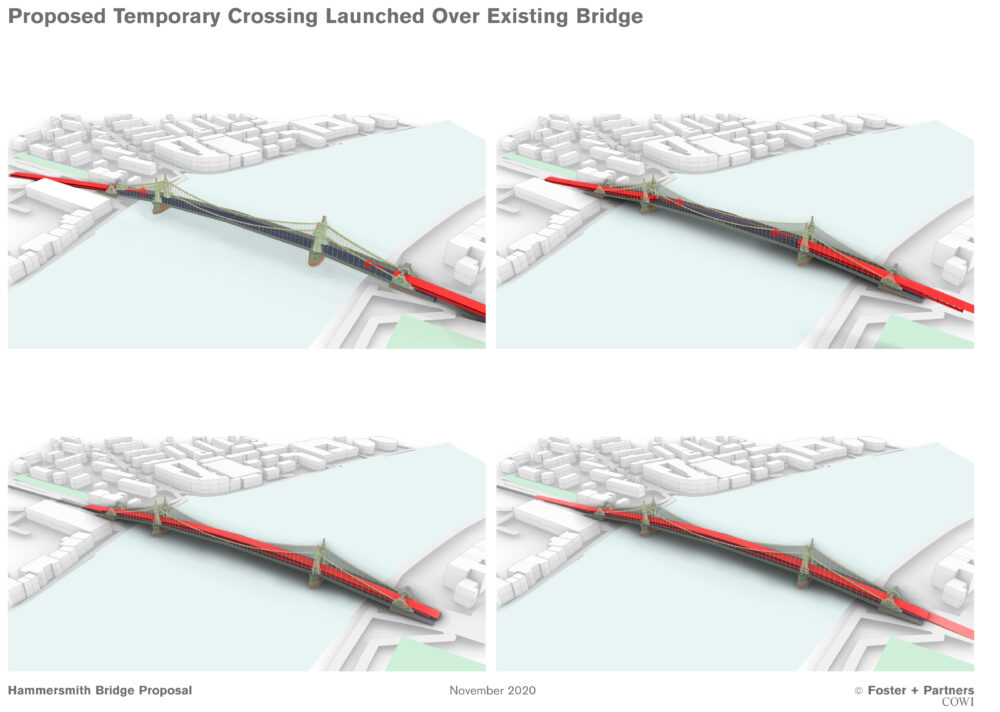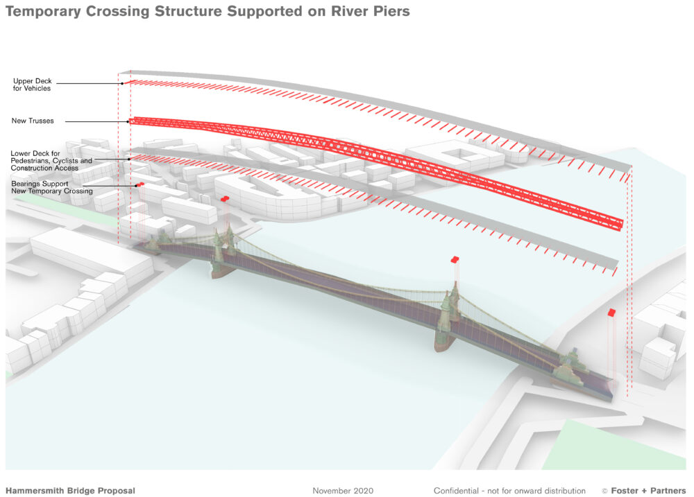 “Elements of the Grade II*-listed bridge that need repair, including pedestals, anchors and chains, would be lifted away using the temporary bridge and transported by barges to an off-site facility for safe repair and restoration.