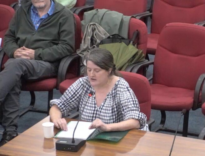 Julia Webb speaking at the Lewisham council standards committee meeting. Cllr Paschoud is seen sat behind her (Picture: Lewisham council)