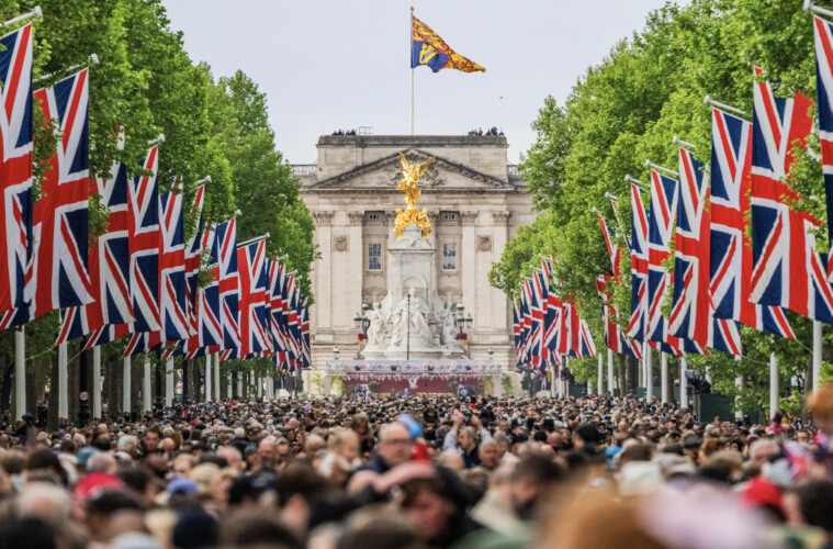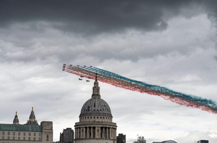 The procession was followed by a flypast of military aircraft, led by one of two operational Lancaster bombers, 23 aircraft including some of the most advanced combat aircraft and the Royal Air Force’s Red Arrows.