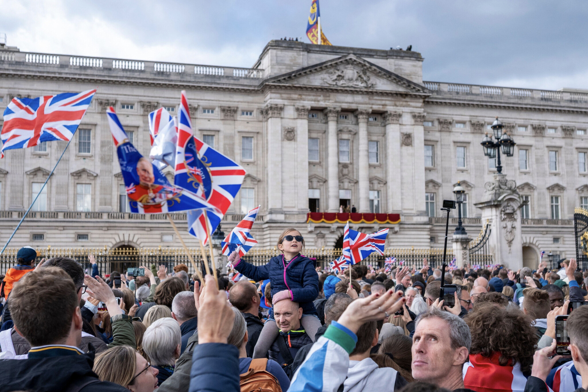 Pictured top: A young girl held aloft as the public wave flags outside Buckingham Palace after the flypast (Picture: Stephen Chung / Alamy Stock Photo)