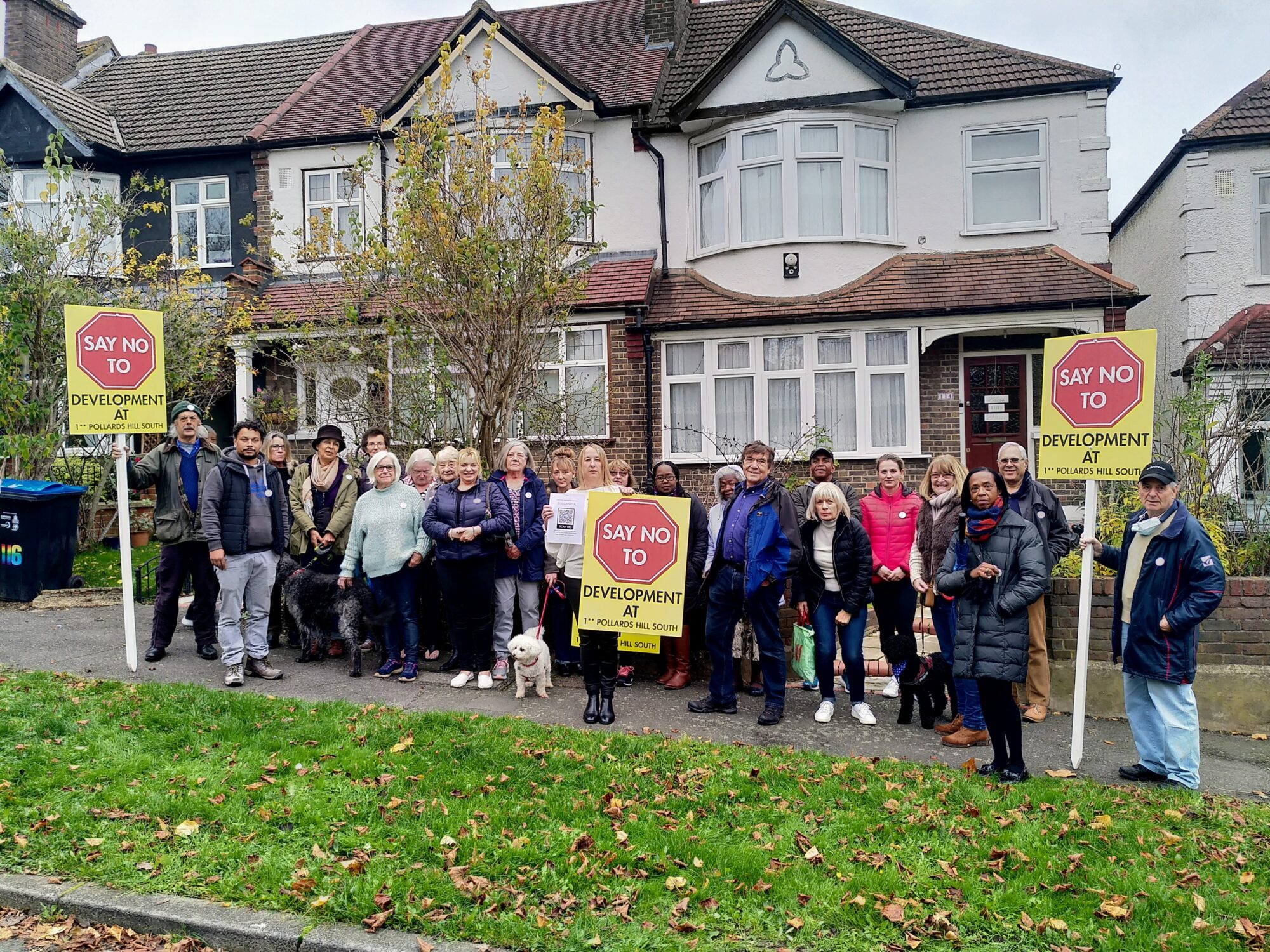 Yellow signs backing a campaign against a new development can been seen in the tree-lined street, Pollards Hill South.