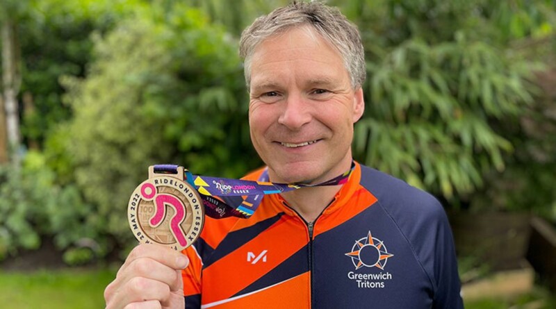 Mottingham’s Mark Hayes, a member of the Greenwich Tritons triathlon club, ran the final stretch pushing his bike to finish in six hours, 35 minutes and 53 seconds.