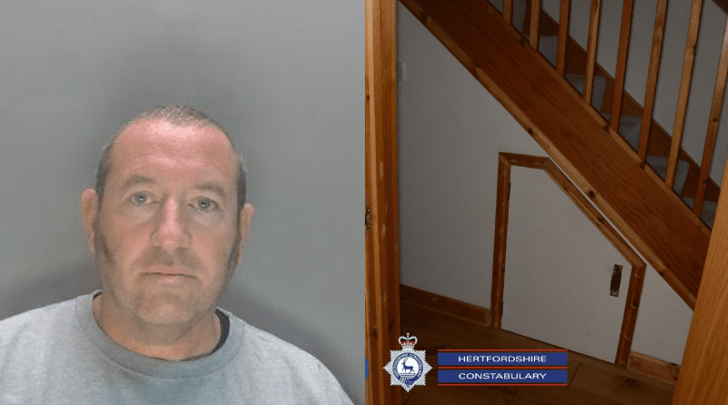 Pictured top: David Carrick left, and the cupboard under the stairs in which he kept one of his victims (Picture: Hertfordshire Constabulary)
