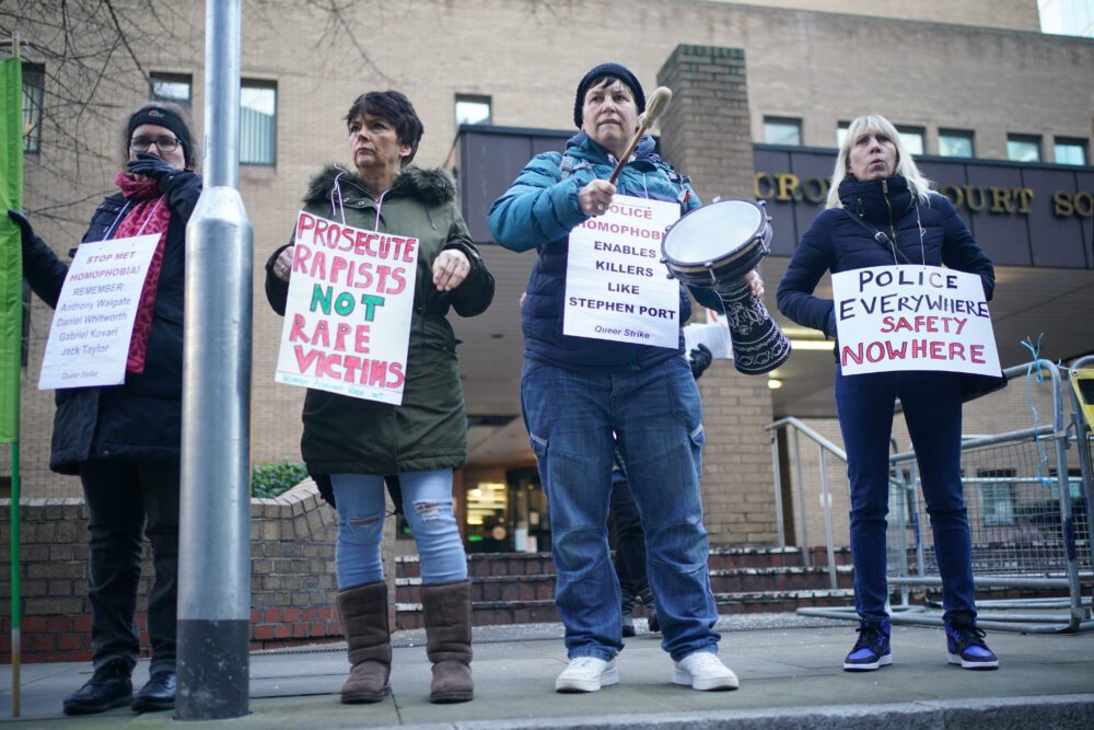 Protesters from Women Against Rape & Women of Colour Global Woman’s strike protest outside Southwark Crown Court ahead of the sentencing of David Carrick (Picture: PA)