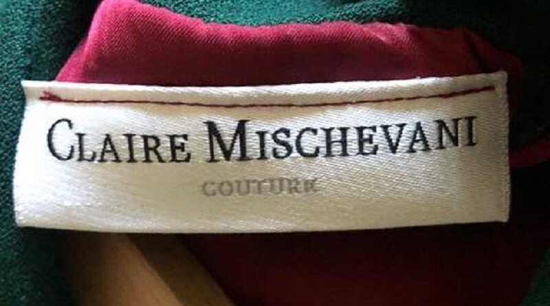 The garment bags feature the words “Claire Mischevani Bridal Couture,” and inside each item of clothing is a label reading “Claire Mischevani Couture” with “Handmade in England” and “Creating heirlooms of the future” on the reverse side.