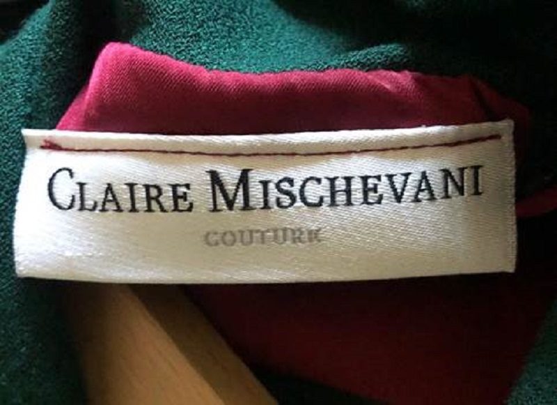 The garment bags feature the words “Claire Mischevani Bridal Couture,” and inside each item of clothing is a label reading “Claire Mischevani Couture” with “Handmade in England” and “Creating heirlooms of the future” on the reverse side.