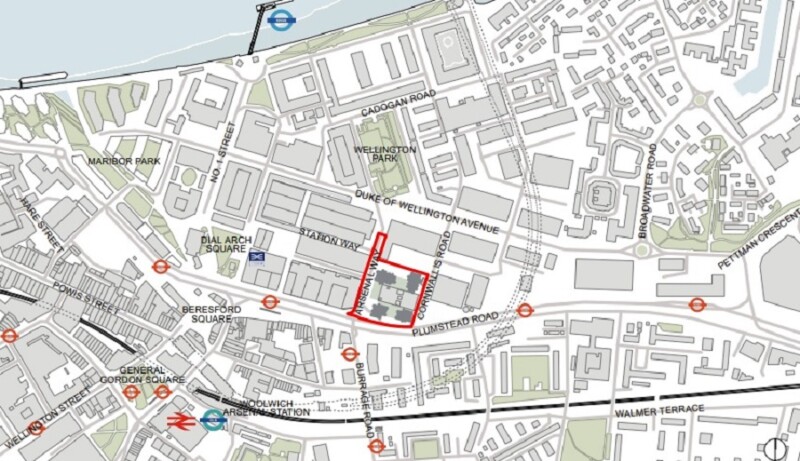 The potential development site is located north of Plumstead Road and between Cornwallis Road and Arsenal Way. It is currently taken up by a facility that provides ventilation for Woolwich Station.