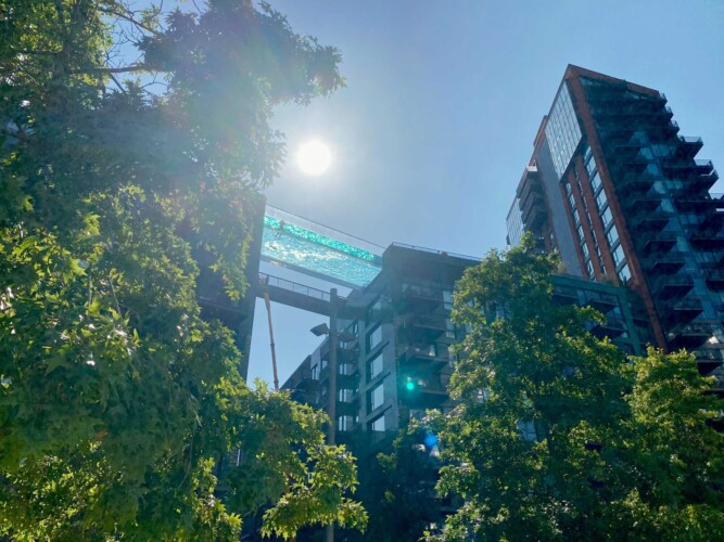 Nine Elms includes multiple buildings and skyscrapers, as well as the US Embassy, cafés, restaurants and an outdoor swimming pool bridged between two towers 35 metres high – the Sky Pool – which opened in May.