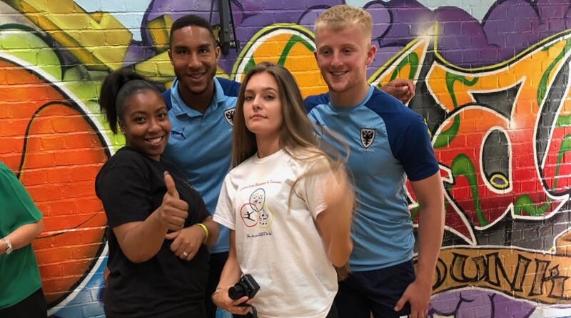 Dons players Terell Thomas and Archie Procter pop into Mitcham’s community centre during their ‘Active Womble Summer Scheme’