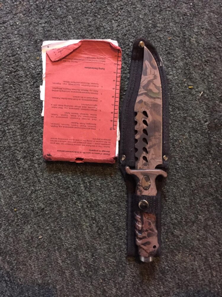 They also found £225 in cash and £1,200 in counterfeit cash as well as a ‘Rambo-style’ knife.