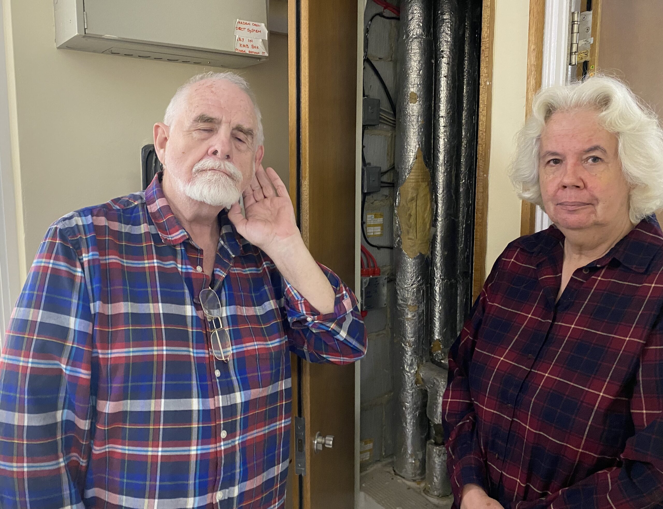 Pictured top: Chris Maher (left) and Maggie Jones (right) by utility cupboards where they heard crickets at Oak House in Putney (Picture: Charlotte Lillywhite)