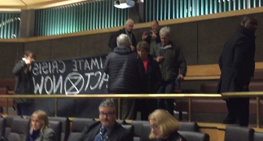 Roughly 10 minutes into the meeting, a band of six activists sitting in the public chamber unfurled a banner and began chanting: “What do we want? Climate action”.