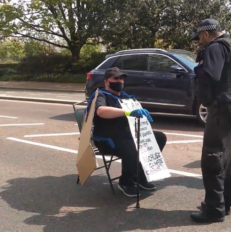 66-year-old retired postman/West End doorman/rave organiser Peter Harrison from Battersea, sat at the Coalbrookdale Gates of Kensington Gardens, whose sign read: “I am terrified about what happens to us disabled, elderly, vulnerable pensioners when society collapses because of climate change.”