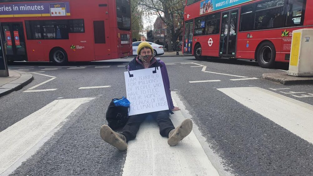 72-year-old artist Fio Adamson from Furzedown stopped traffic in Sloane Square for 20 minutes, wearing a sign that read: “I’m terrified for millions of people who have to flee their homes because of the climate crisis.”