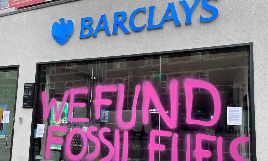 At around 8am the message “we fund fossil fuels” was chalk-sprayed in large pink letters across the window of the Barclays branch in St John’s Hill, Clapham Junction.