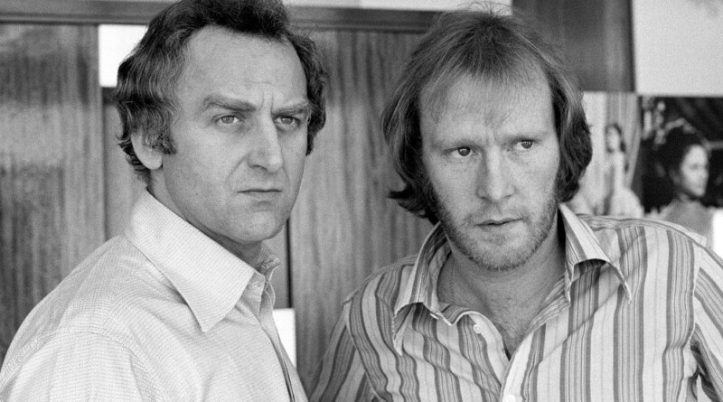Pictured top: Dennis Waterman and John Thaw giving a preview of The Sweeney in 1974 (Picture: PA)