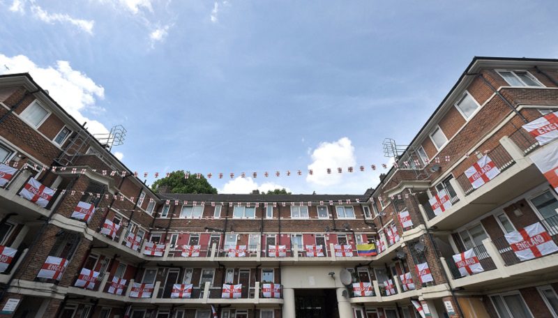 England flags have been put up on the Kirby Estate in Bermondsey where residents are showing their support for the England squad during the World Cup tournament in Russia.