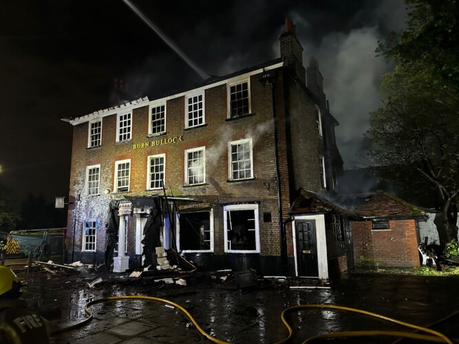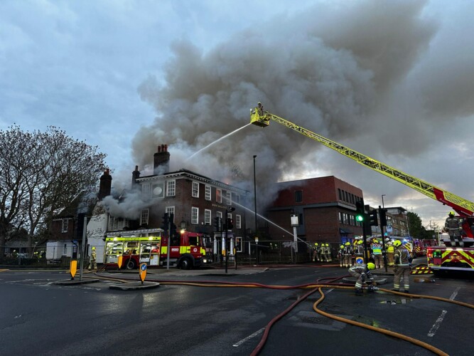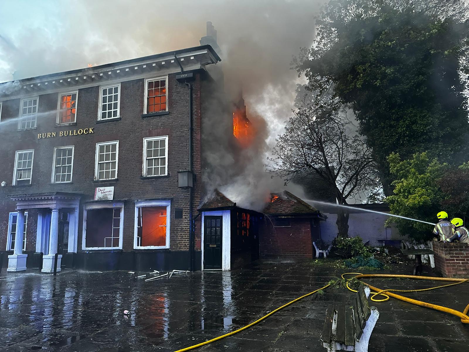 Twelve fire engines and about 80 firefighters tackled the blaze at the Grade II-listed Burn Bullock pub in London Road.