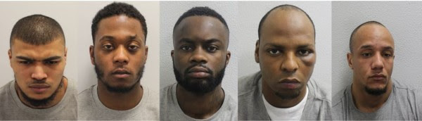 The gang, pictured left to right, are: Ishmael Baptiste, Richard Roberts, Samir Smith, Mohammed Adan and Michael Ashman