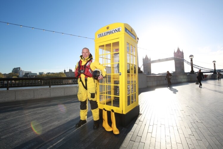 An iconic red phone box beside the River Thames was turned yellow this May Day to kick off the RNLI’s 2018 Mayday fundraising campaign.