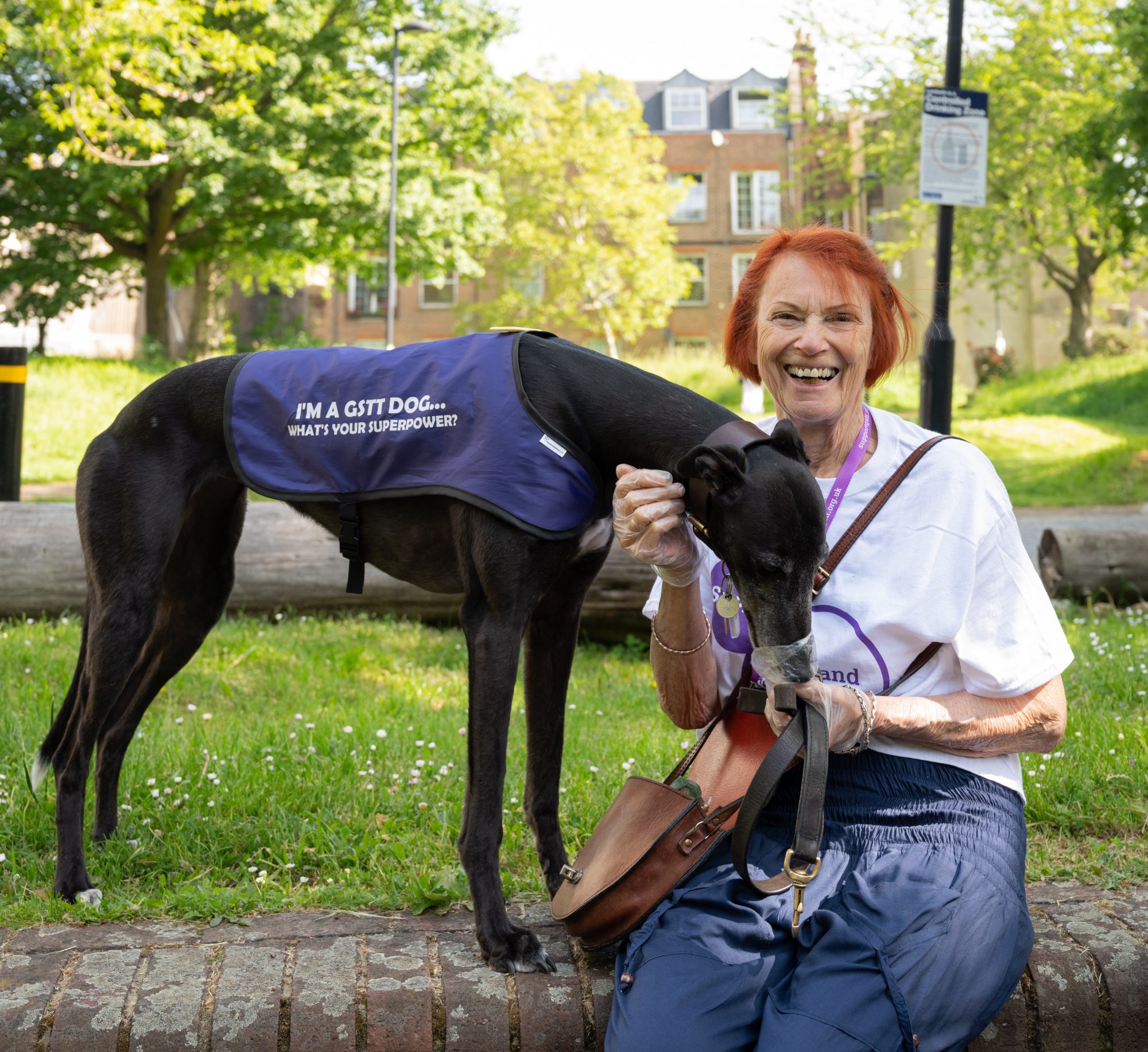The grandmother-of-19 and great-grandmother-of-five volunteers at St Thomas’ Hospital with Dido, aged five.