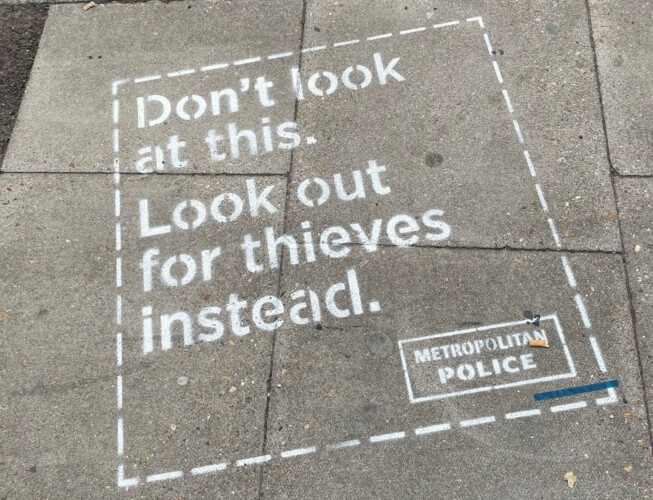 The council, in collaboration with the Met, also recently ran an awareness campaign with chalk stencils which said ‘Don’t look at this. look out for thieves instead,’ displayed around Greenwich town centre in crime hotspots.
