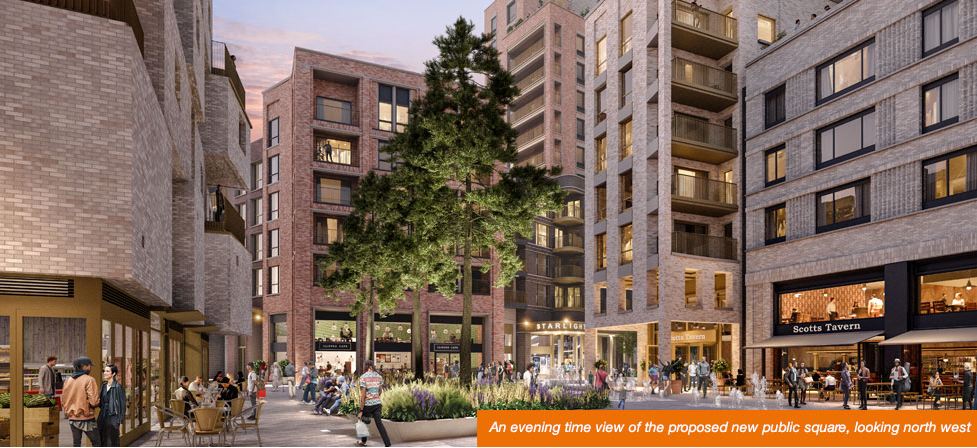 The proposal would see six blocks built of varying heights up to 21 storeys with 742 homes, a new five screen cinema, leisure facilities and a children’s nursery.