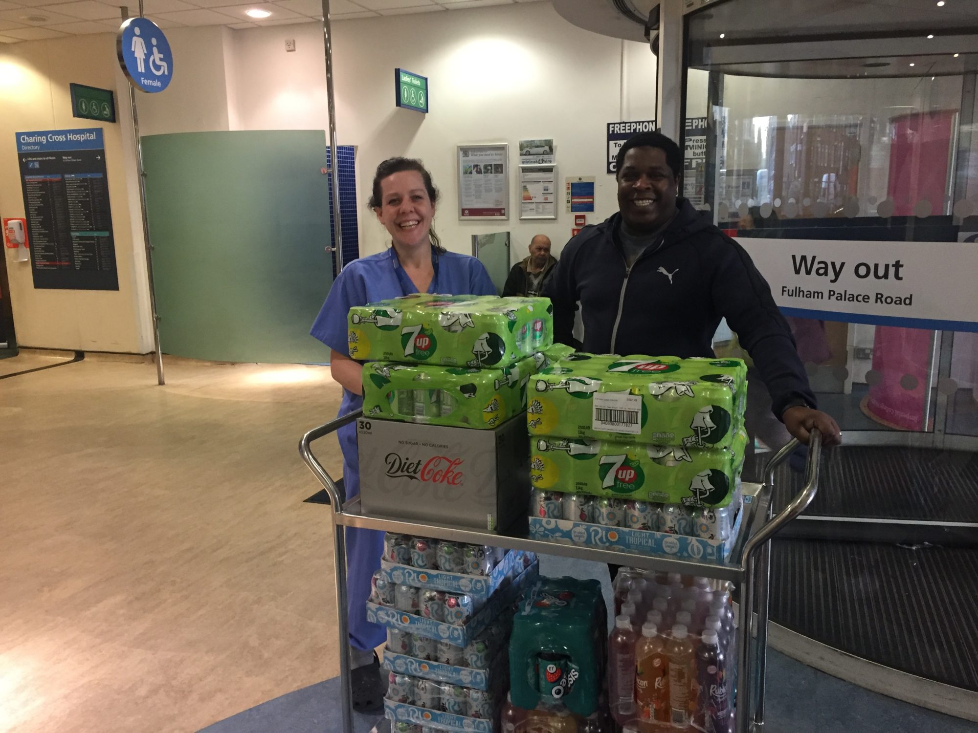 Staff sweltering in hot safety kit at Charing Cross Hospital have been provided with more than 1,000 bottles and cans of drink by a swiftly-formed alliance of firms, NHSMyRound.