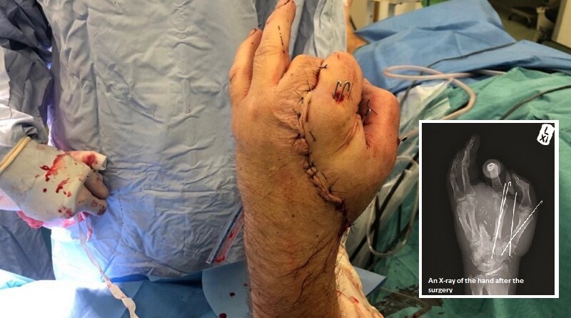 Two surgeons have been praised for their stamina after saving a man’s left hand which was “hanging on by skin and bone” in a 17-hour surgery.