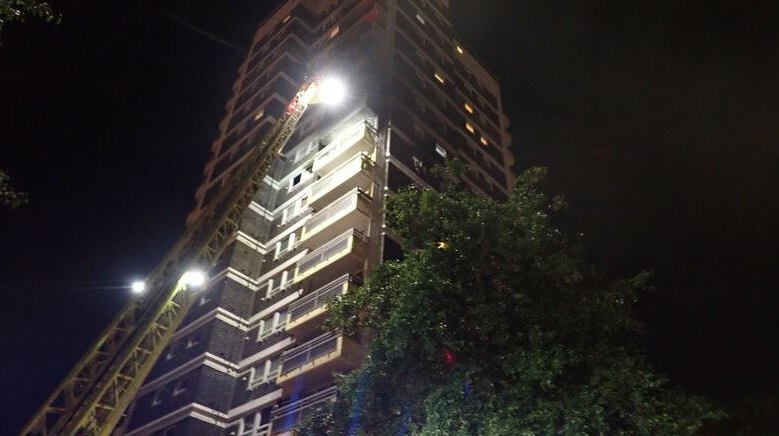 A 10th-floor flat was badly damaged by a blaze in which four people had to be led to safety by firefighters.