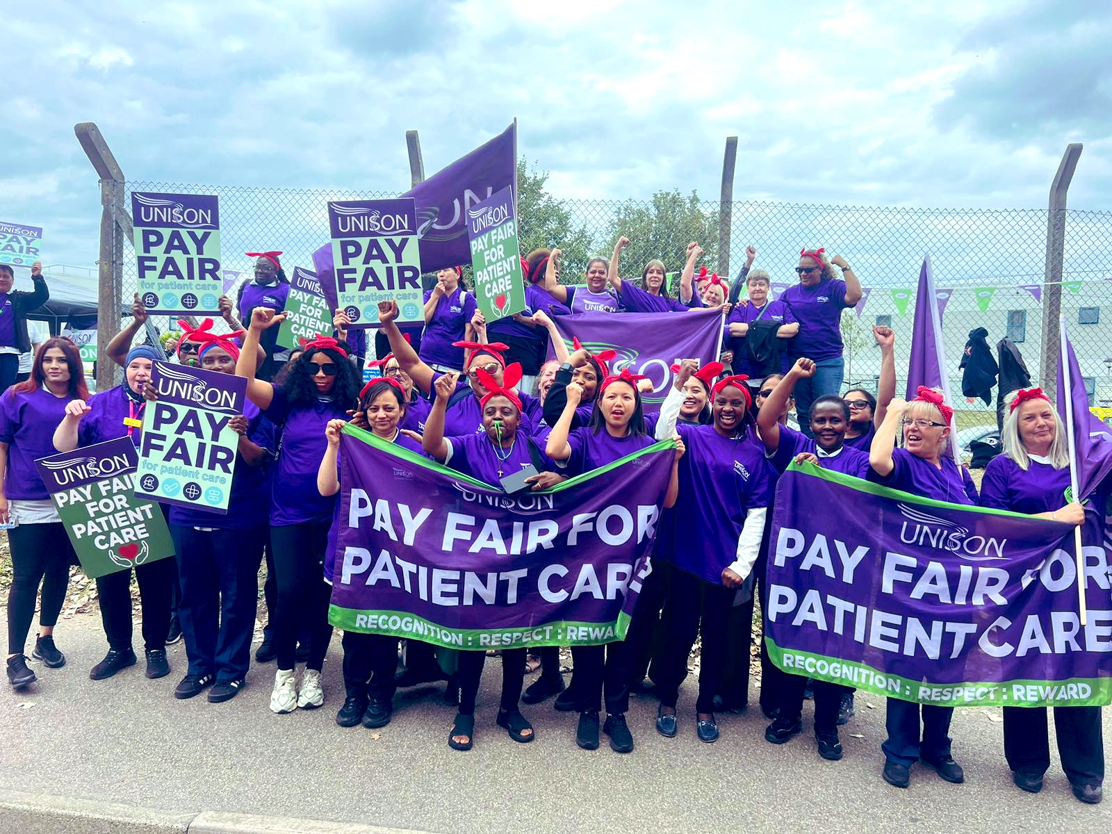 Pictured top: Healthcare support workers from University Hospital Lewisham and Queen Elizabeth Hospital take to the picket line in September (Picture: Unison)