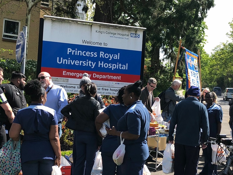 Cleaners, porters and security staff at the Princess Royal University Hospital in Bromley, and the Queen Elizabeth Hospital in Woolwich were among the workers that queued for food packages last Friday after a bitter pay dispute with their employers ISS.