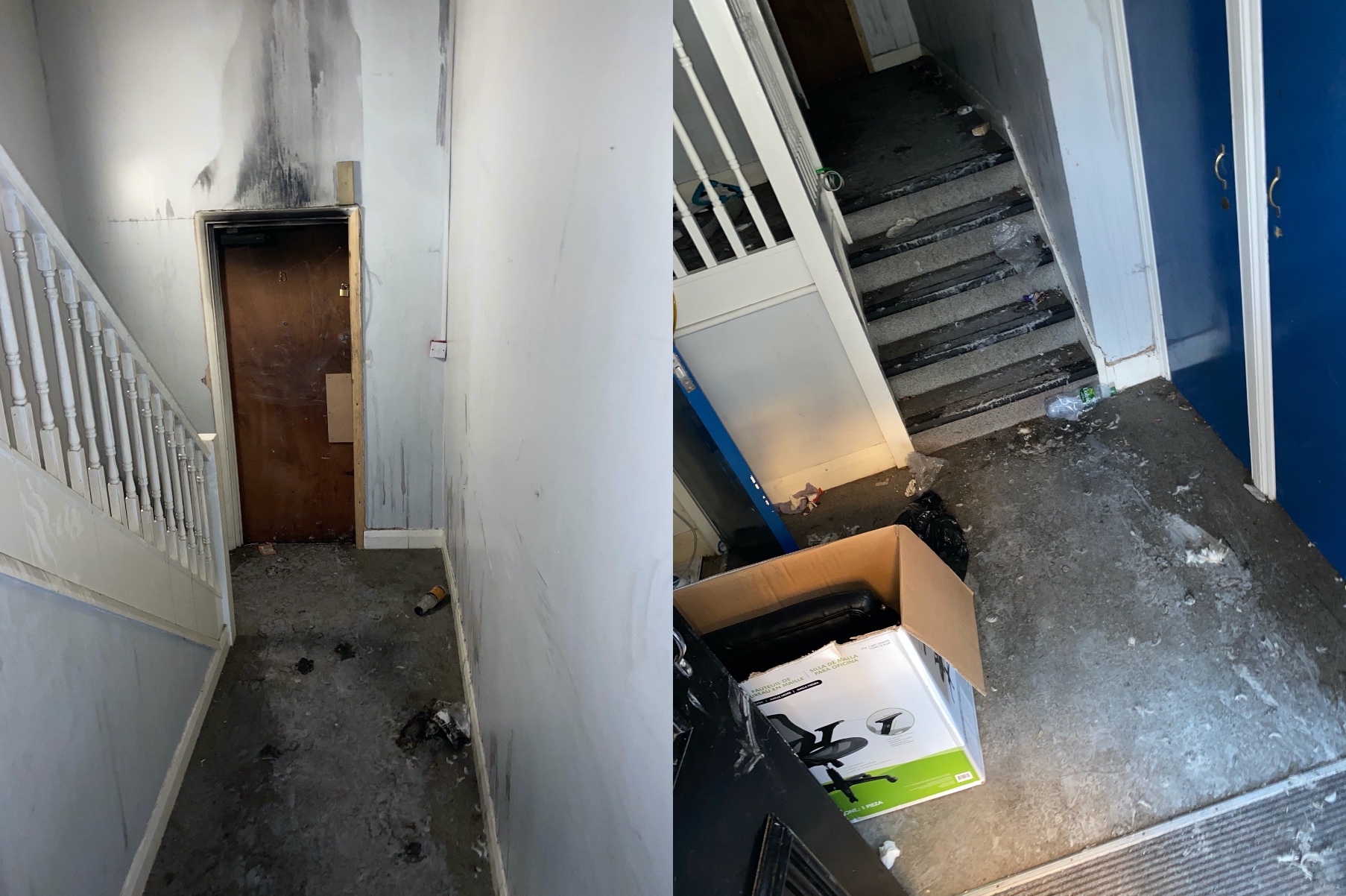 Just hours earlier the fire brigade had broken the family’s door in to tackle the blaze and windows were broken as the fire was brought under control.