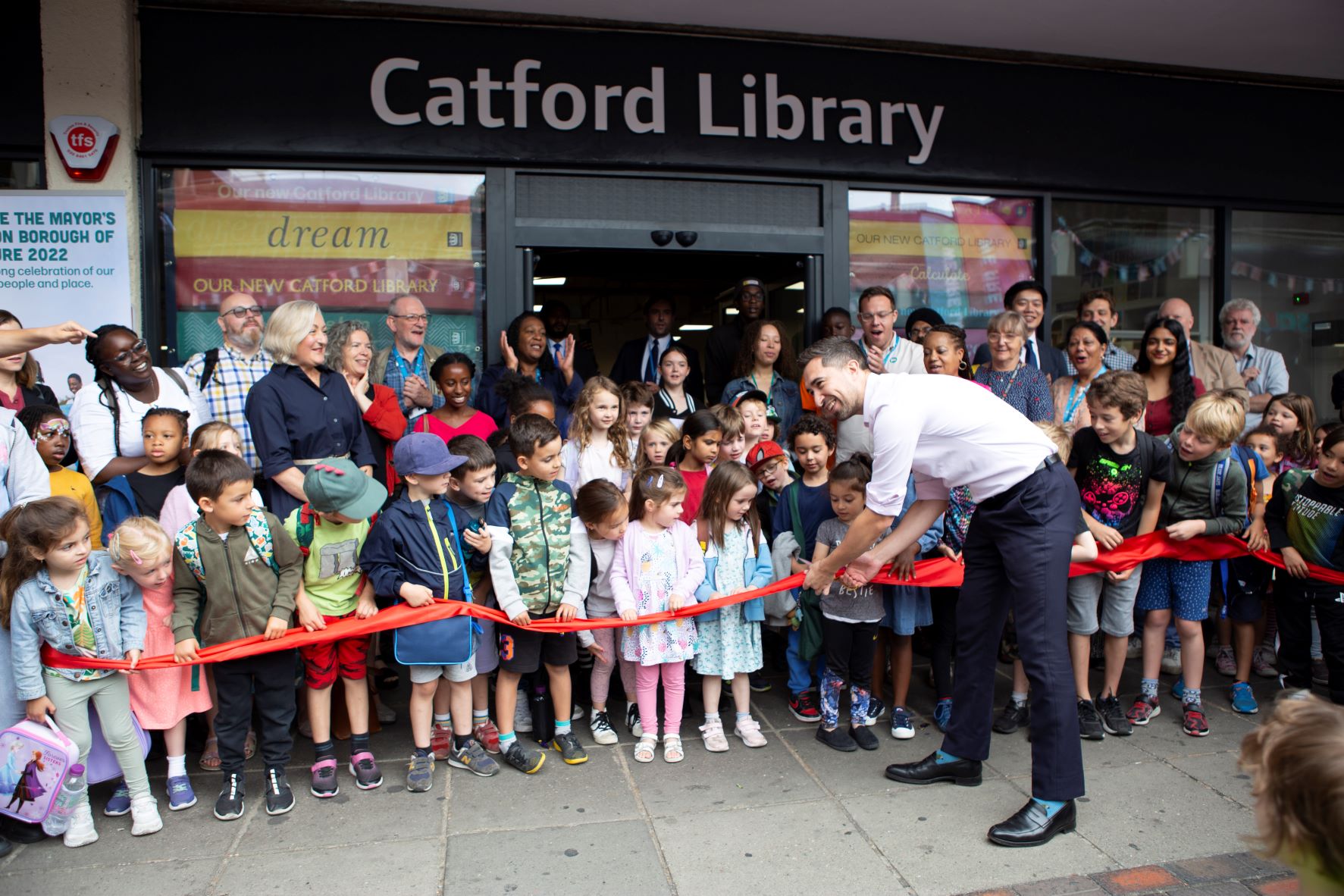 The Mayor of Lewisham, Damien Egan, cut the giant red ribbon held up in front of the new library by the children of Rathfern Primary School Holiday Club.