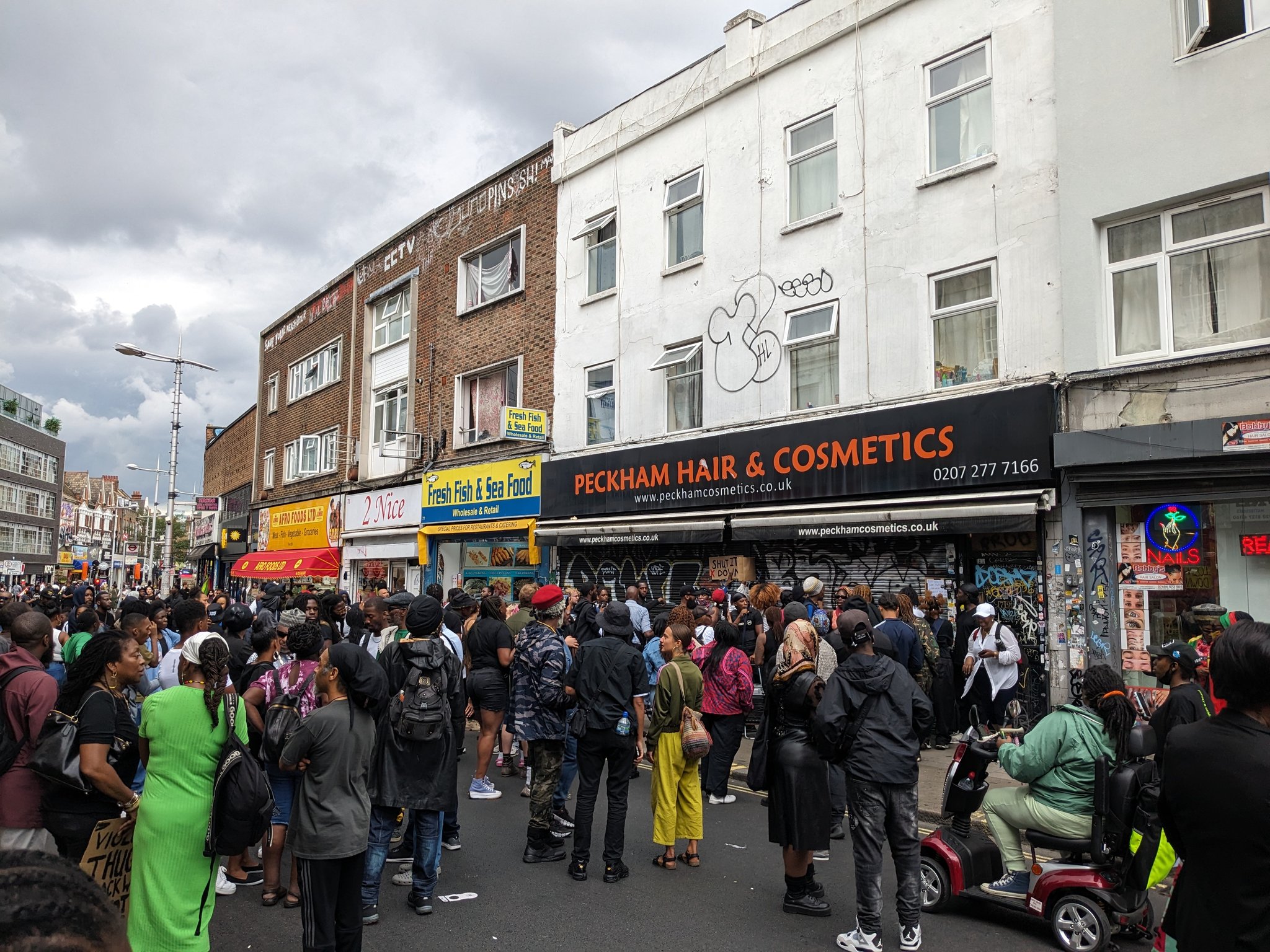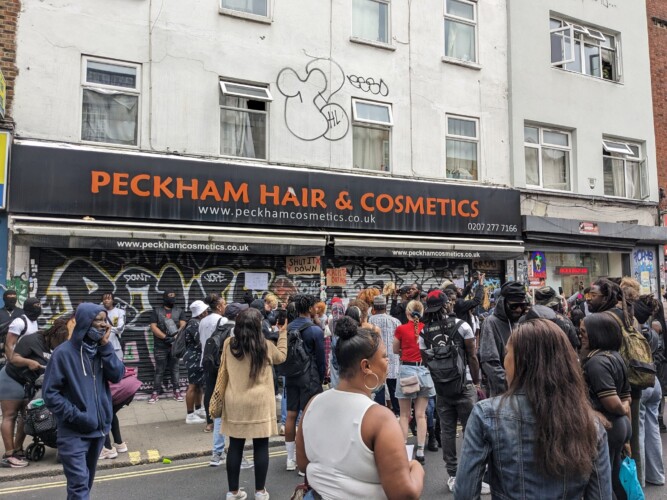 Hundreds of ‘angry’ protesters have blocked Rye Lane in Peckham this afternoon after a video posted to social media yesterday showed a woman being strangled by a shop worker.