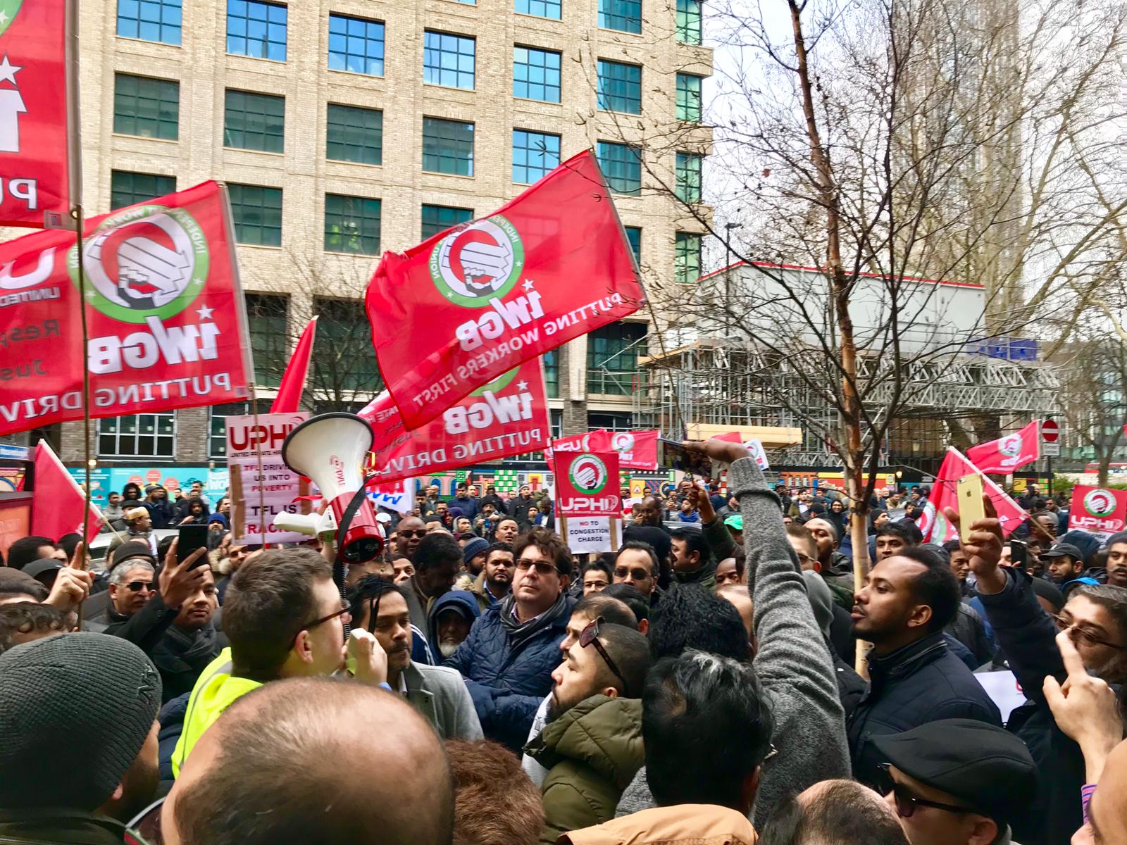 The protest from 10am-noon by the Independent Workers Union of Great Britain’s (IWGB) United Private Hire Drivers branch (UPHD) saw cabs parked along the Cut, Union Street and Blackfriars Road. Protesters assembled outside TFL’s Palestra House office and marched up to Blackfriars Bridge.