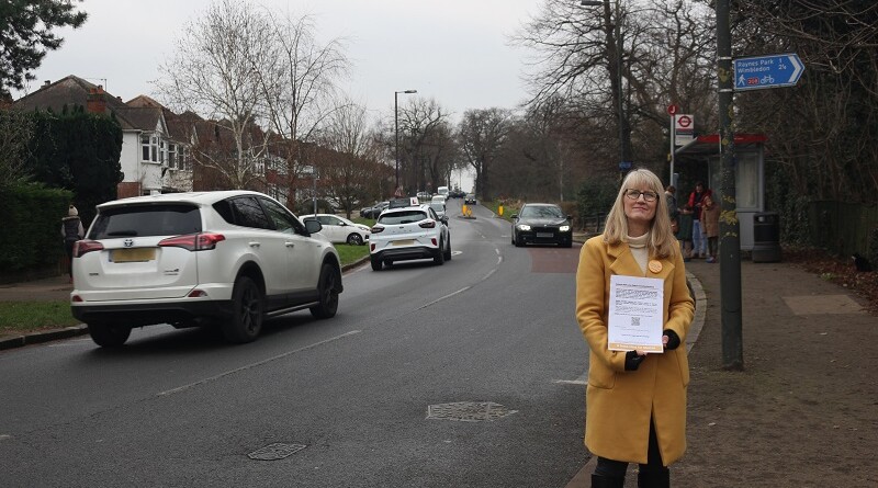 Pictured: Lib Dem councillor Jenifer Gould on Cannon Hill Lane with a petition for a zebra crossing. Credit: Merton Liberal Democrats.