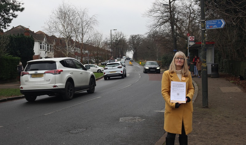 Pictured: Lib Dem councillor Jenifer Gould on Cannon Hill Lane with a petition for a zebra crossing. Credit: Merton Liberal Democrats.