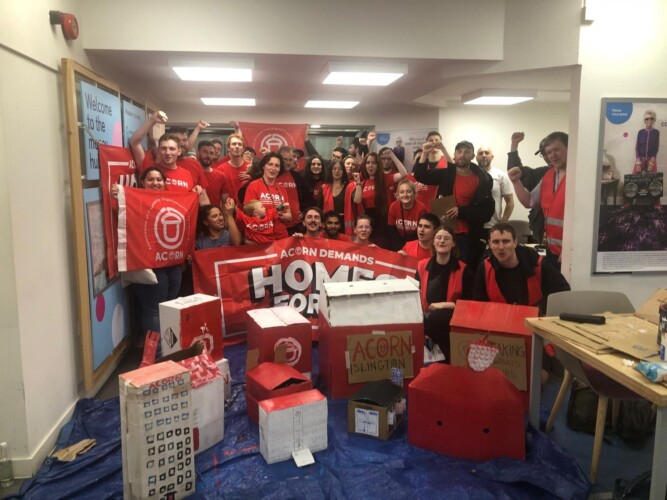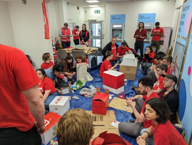 Members of Acorn’s Lambeth and Southwark branches infiltrated the TBS bank in High Road, Tottenham, forcing it to shut for the morning by building cardboard houses and sharing speeches.