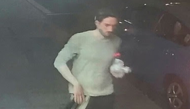 The suspect is a described as a white male, wearing black bottoms, a beige jumper, with a face mask pulled down to his chin.